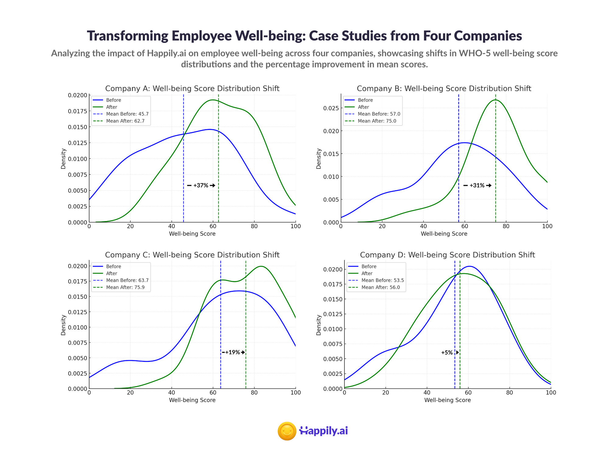 Company D: Mean wellbeing score increased from 53.5 to 56.0—a 5% improvement